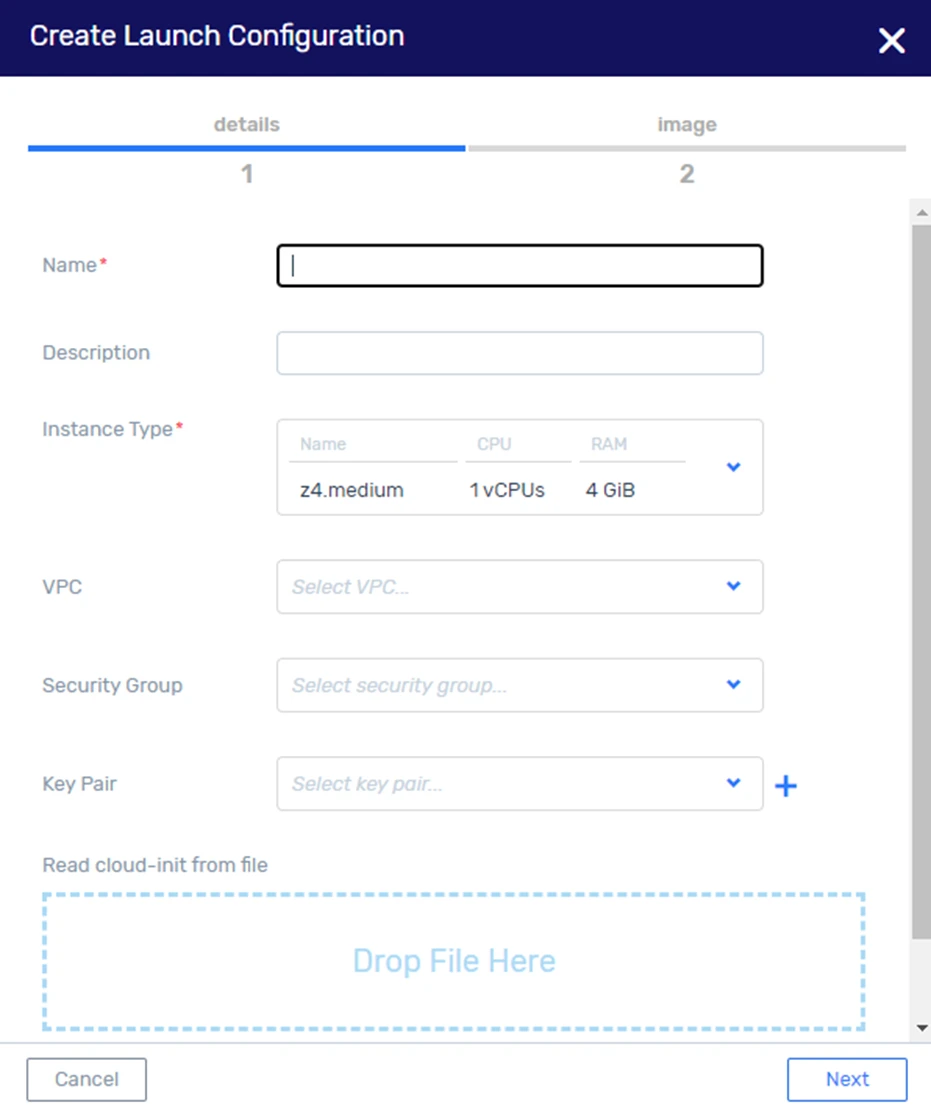 Go to Compute > Launch Config and select Create. The launch configuration creation window will open with two tabs: Details and Images.