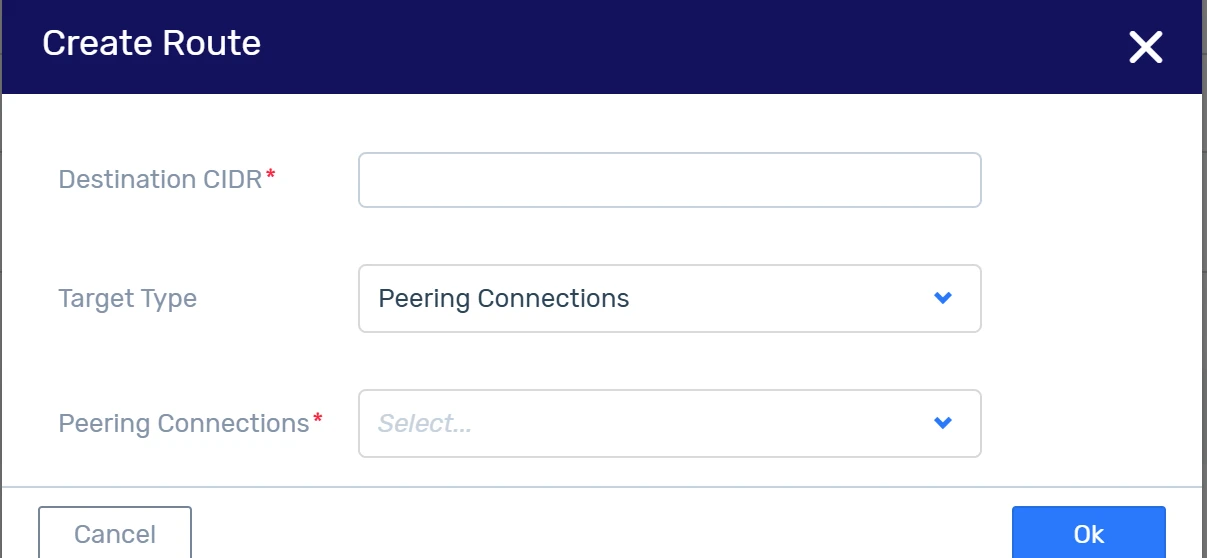 In the "Create Route" dialog, select Target Type = Peering Connections, and then choose the CIDR in the receiving VPC.